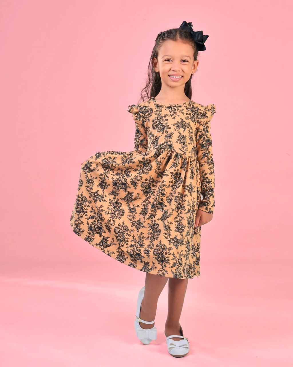 Vestido infantil Milon confeccionado em tecido macio, com estampa floral elegante sobre fundo bege. Possui mangas longas, babadinhos nos ombros e modelagem rodada, garantindo conforto e um visual encantador. Ideal para passeios e ocasiões especiais. Um look delicado e cheio de charme para as pequenas princesas da Loja Castelo da Liz.