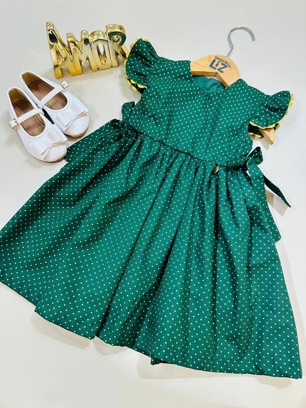 Confeccionado com algodão de alta qualidade, este vestido é ideal para festas e comemorações. Seu design em poá verde com detalhes em dourado confere um toque de sofisticação e charme, permitindo que sua menina se destaque em qualquer ocasião.
